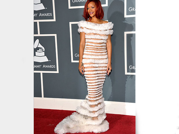 menerawang rancangan Jean Paul Gaultier. Dengan perpaduan warna putih dan transaparan, gaun tersebut memperlihatkan lekuk tubuh Rihanna secara jelas. Tatanan rambutnya kali ini cukup sangat simpel tetapi tetap elegan. Ia memadukan gaun uniknya dengan sepatu rancangan Christian Louboutin.